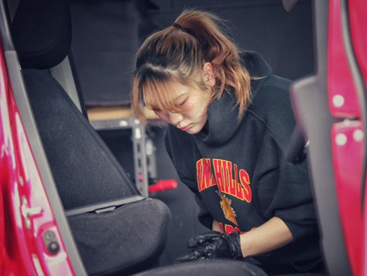 商品車の清掃や納車前の準備、画像撮影などを担当しています!皆様が気持ちよく納車日を迎えられるように気持ちを込めてお仕事しています!